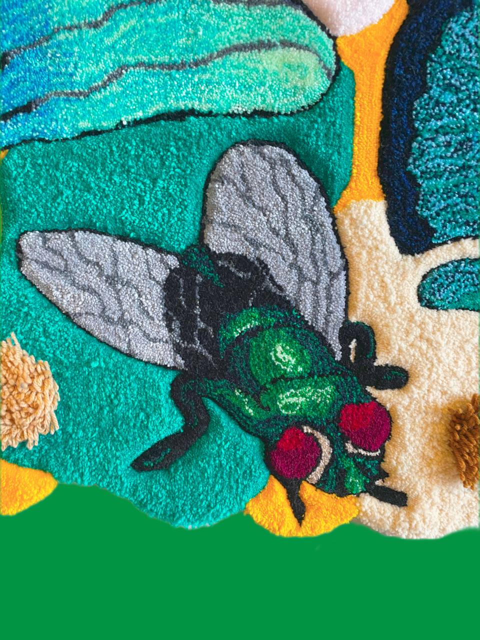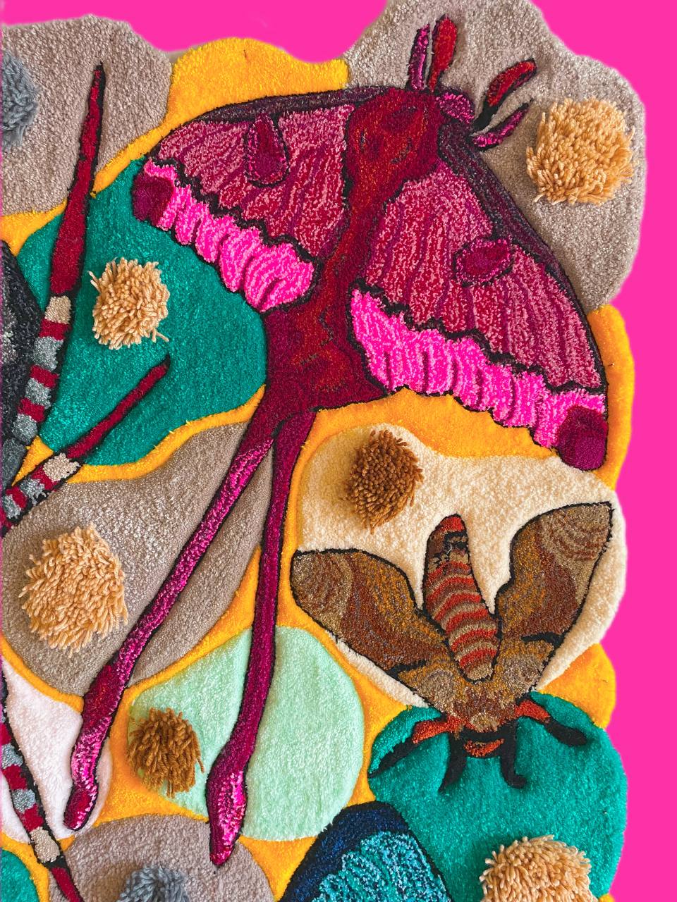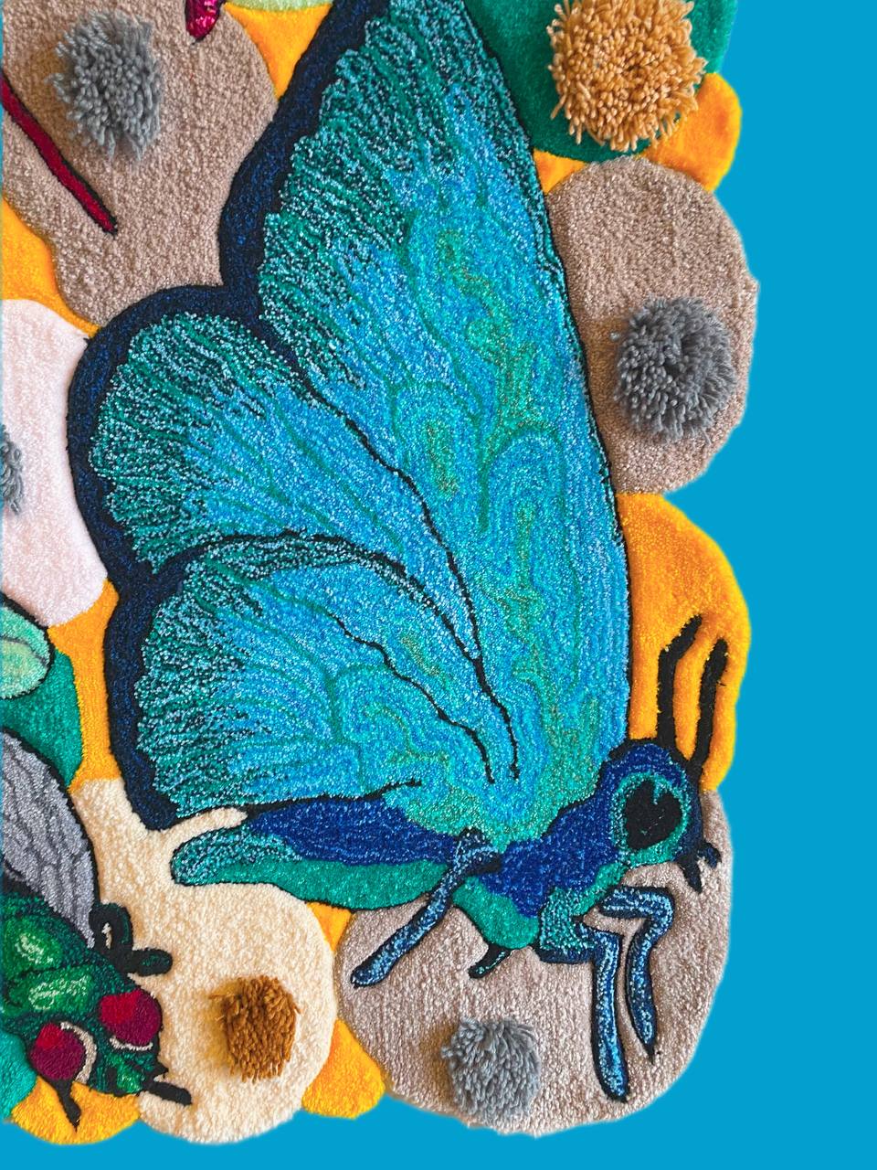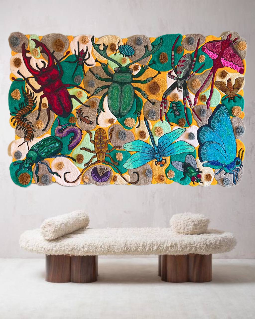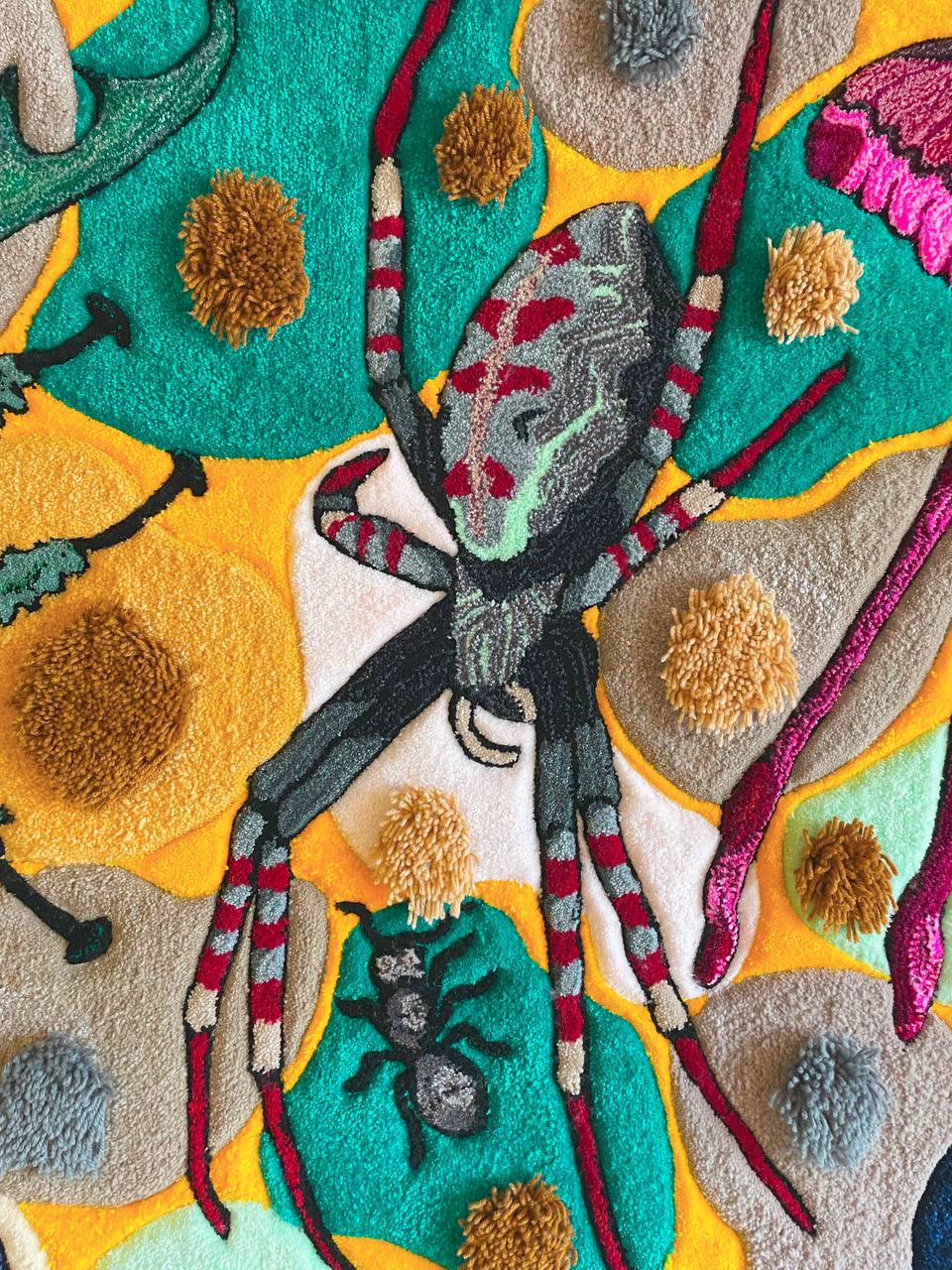 It depicts 16 different beetles, each with its own character and details. The rug is made in a bright, colorful palette and has a multi-level pile, creating an effect of volume and depth. This is not just an interior item — it is a full-fledged work of art.